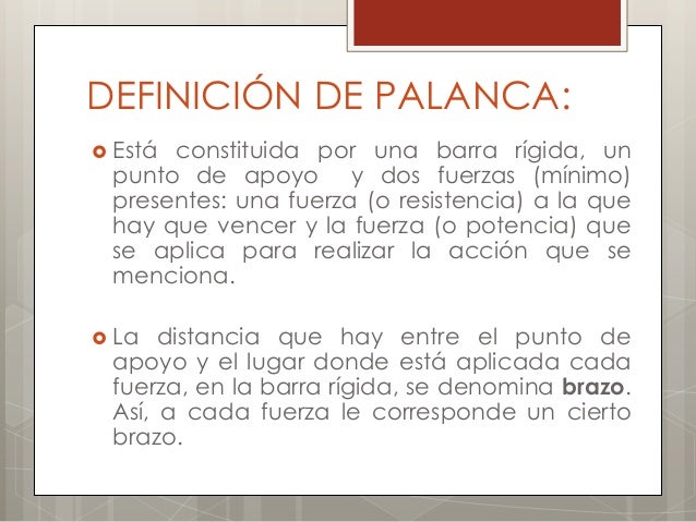 Palanca definicion fisica. Arquímedes 287-212 aC un científico de la antigua Grecia logró explicar el funcionamiento de la palanca proclamando una famosa fraseDadme un punto de apoyo y moveré el mundo. Se define a la palanca como una barra rígida apoyada en un punto sobre la cual se aplica una fuerza pequeña para obtener una gran fuerza en el otro extremo. Las palancas facilitan el movimiento de objetos y la aplicación de la fuerza. Una palanca es una máquina simple fabricada con una barra que puede moverse alrededor de un punto fijo llamado punto de apoyo. Como vamos a ver este concepto no está muy lejos de lo que significa el apalancamiento financiero que utiliza mecanismos financieros a modo de palanca para aumentar las posibilidades de inversión. El término palanca alude a una especie de fuerza o al menos así se concibe en el área de las ciencias exactas específicamente en la Física la cual consiste en una herramienta que por lo general se trata de una tabla o superficie lisa que transmite gracias a un elemento colocado en su parte posterior fuerza y desplazamiento.